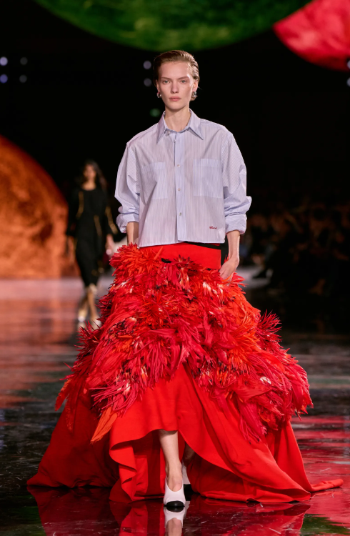 Matthieu Blazy left Bottega Veneta for Chanel, where he presented drop-waist dresses, cropped jackets, and modern takes on the classic pencil skirt. The silhouettes sat low on the hip, creating that coveted fit-and-flare proportion that flatters almost every body type. His use of tweed—Chanel’s signature fabric—felt fresh, not dusty. His use of tweed, Chanel’s signature fabric, felt fresh and inspiring.