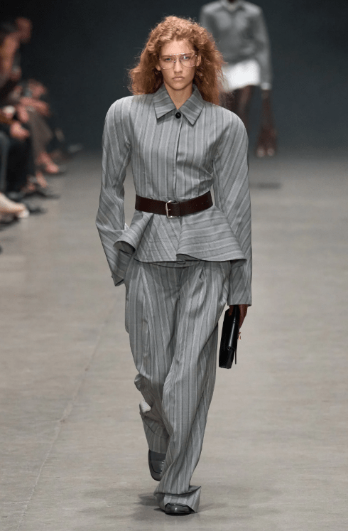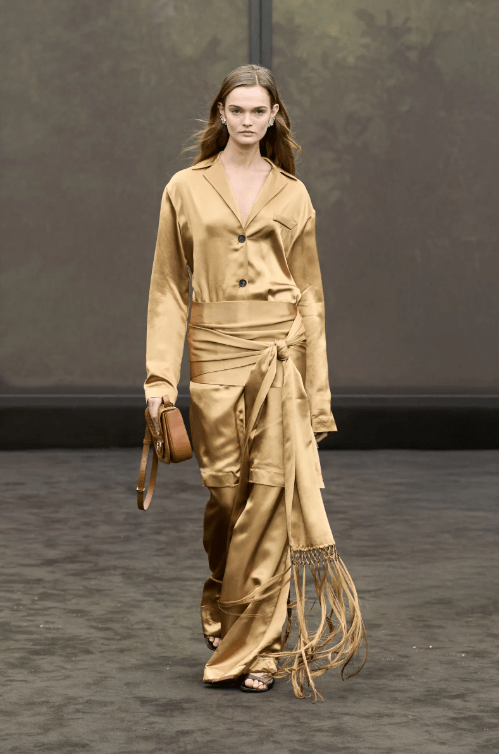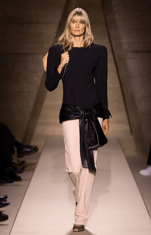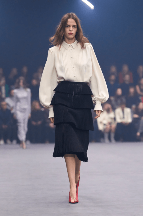 Anthony Vaccarello at Saint Laurent showed tailored blazers with strong shoulders paired with leather pencil skirts. Chloé’s Chemena Kamali presented party dresses with puffed sleeves and structured shoulders. Stella McCartney went full corporate glamour with boxy blazers and wide-leg trousers.