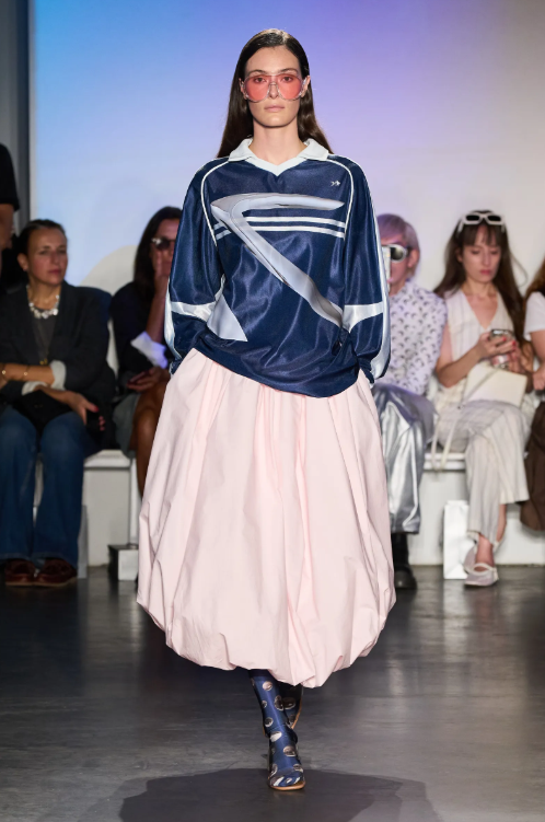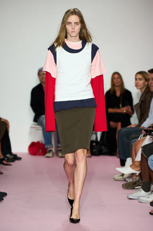 From models wearing simple white T-shirts with enormous feather skirts at Chanel, to Louise Trotter at Bottega Veneta pairing chunky knit sweaters with sleek, architectural skirts made from recycled fiberglass. The contrast was striking and inspiring all at once. Besides the t-shirt, the other standout item in this trend is the track jacket. Picture it paired with lace trim shorts or a statement skirt. Workwear was also reimagined here. It ranged from tailored button-down tops with a bralette on top to jeans with a skirt attached. This is all about layers, mixed textures, and more layers.