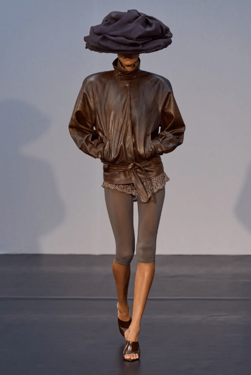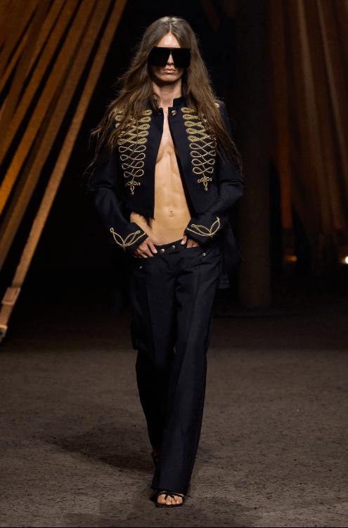 Alexander McQueen revived the iconic “bumster” low-rise pants from Lee McQueen’s archive, showing skin at the lower back. Hermès, a house known for conservatism, showed low-cut leather bustiers under tailored jackets.