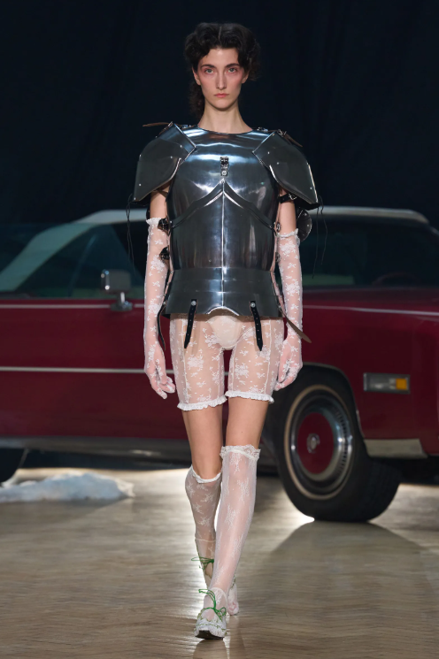 Yuhan Wang showed a knight’s breastplate as outerwear. Not metaphorical. Literal armor. Burberry and Chopova Lowena both had armor-inspired structures, metallic finishes, and protective silhouettes.